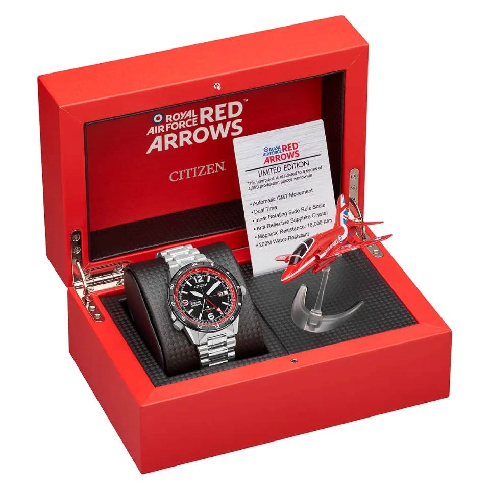 In celebration of the RAF Red Arrows 60th Display Season, Citizen is proud to present the latest addition to its Red Arrows collection. The Limited Edition Red Arrows Promaster Automatic GMT flight-ready timepiece is a mission-focused powerhouse, featuring a sturdy construction stainless steel case with a 24-hour bezel and two bold crowns to match. Luminous hands and markers contrast against a black sunray dial accompanied by the official RAF Red Arrows logo. An aeronautical slide-rule scale surrounds the display and is operated by an 8 o'clock crown and a red-accented 24-hour hand which can be used to display two different time zones simultaneously. Inside this timepiece is the Citizen Calibre 9054, an automatic mechanism featuring a 50-hour power reserve and magnetically resistant up to 16000 A/M to maintain accuracy. This timepiece is limited to 4,999 pieces worldwide, features the iconic Diamond Nine engraved on the case back and is presented in a limited edition box with plaque and model Corgi Red Arrows plane